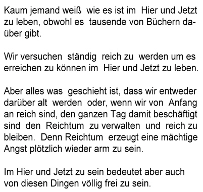 Dabei fühlen wir uns ständig schlecht und einsam, egal ob arm oder reich, suchen nach Anerkennung und Liebe und finden sie nicht wirklich. So leben wir nicht sondern überleben nur und wenn wir damit so weitermachen werden wir auch dies nicht mehr hinbekommen. Unsere Kinder werden bald erfahren von was ich hier schreibe. Teilweise sehen wir es ja jetzt schon.